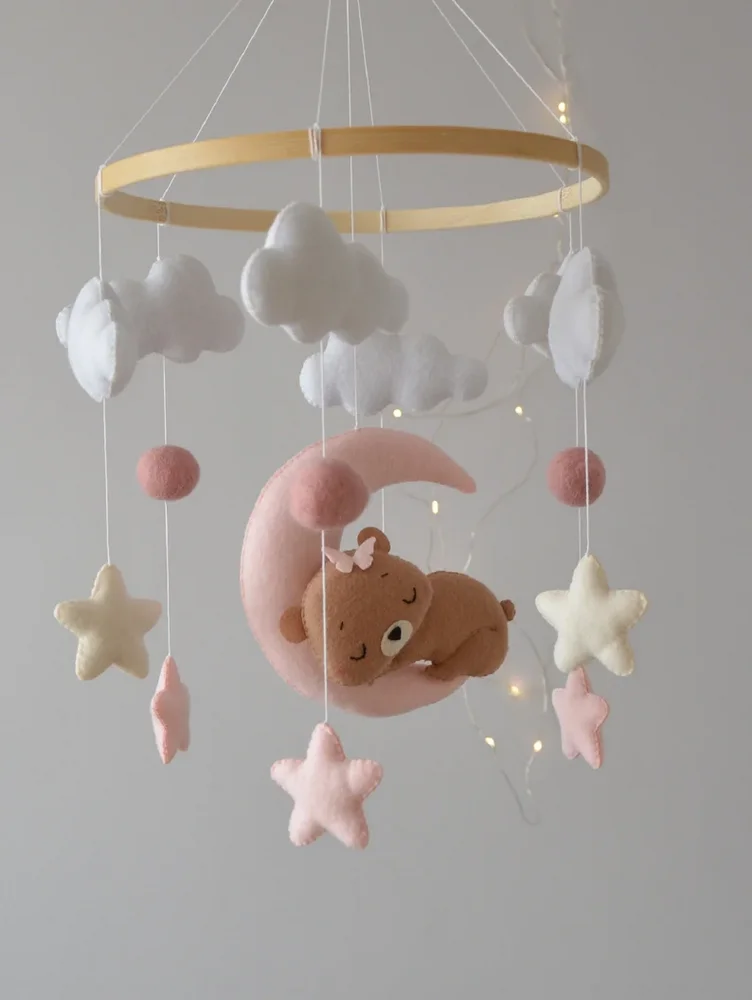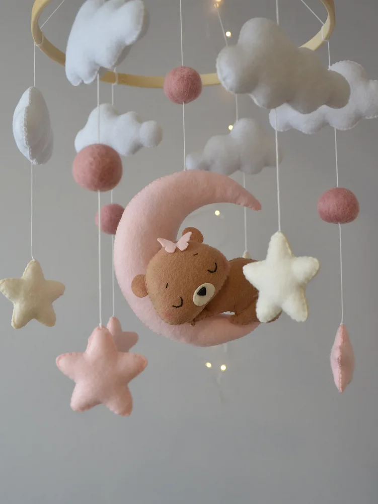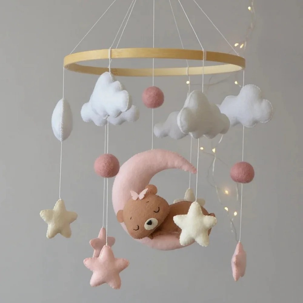 Custom boy girl stuffed soft toy felt teddy sleepy bear moon forest star cloud nursery baby crib mobile for kid room decoration